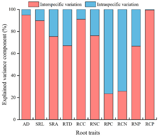 Variance partitioning of different fine root traits at interspecific and intraspecific scales. Abbreviations of fine root traits are given in Table 1. AD: Average root diameter; SRL: Specific root length; SRA: Specific root area; RTD: Root tissue density; RCC: Root carbon content; RNC: Root nitrogen content; RPC: Root phosphorus content; RCN: Root carbon and nitrogen ratio; RNP: Root nitrogen and phosphorus ratio; RCP: Root carbon and phosphorus ratio.