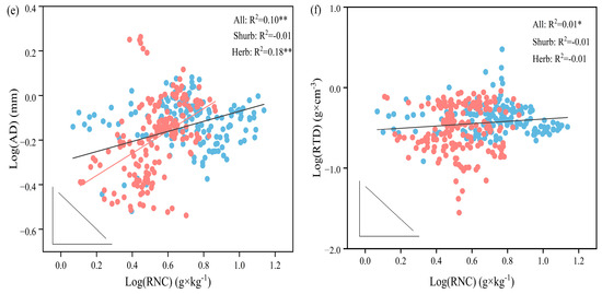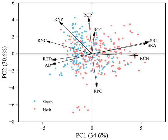 Each fine root trait had the highest variation at the interspecific level, with the coefficient of variation ranging from 21.83% to 105.79% (Table 3). For both shrubs and herbs, SRL had the highest interspecific variation, while AD in shrubs and RCC in herbs had the lowest interspecific variation. Interspecific variation differed greatly among life forms. Shrubs had higher variation than herbs in RTD, RCC, RNC, RCN, RNP, and RCP. However, herbs had higher variation than shrubs in AD, SRL, SRA, and RPC. The relative magnitudes of the intraspecific and interspecific variations indicated that the coefficient of variation for shrubs, herbs, and communities was greater for interspecific variation than for intraspecific variation (Table 3).