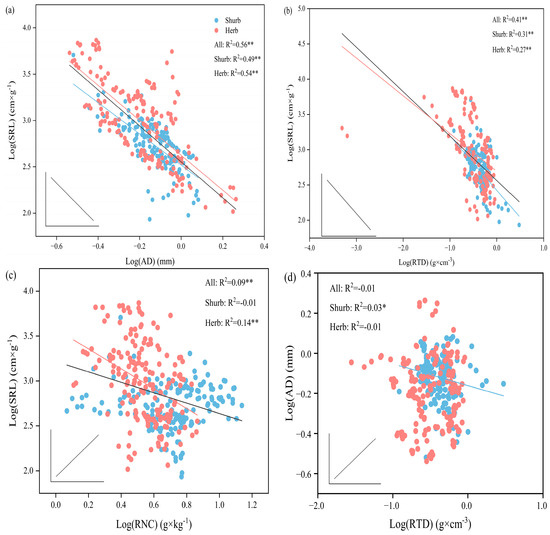 Relationships among key traits of fine roots of 25 desert plants. The insets indicate the expected relationships based on the RES hypothesis. In the figure, scatterplot points of different colors indicate shrubs and herbs. Abbreviations of traits are given in Table 1. Significant correlations are denoted with asterisks: ‘*’ for p < 0.05, ‘**’ for p < 0.01. The blue, red and black lines represent shrubs, herbs and all species, respectively. AD: Average root diameter; SRL: Specific root length; SRA: Specific root area; RTD: Root tissue density; RNC: Root nitrogen content;. The subfigures represent the predicted trend between two traits in the root economic spectrum.