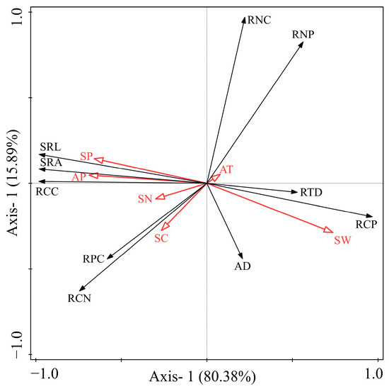 Redundance analysis (RDA) sequencing of 10 fine root traits and environmental factors (soil and meteorology). AD: Average root diameter; SRL: Specific root length; SRA: Specific root area; RTD: Root tissue density; RCC: Root carbon content; RNC: Root nitrogen content; RPC: Root phosphorus content; RCN: Root carbon and nitrogen ratio; RNP: Root nitrogen and phosphorus ratio; RCP: Root carbon and phosphorus ratio; AT: Annual average temperature; AP: Annual average precipitation; SW: Soil water content; SC: Soil carbon content; SN: Soil nitrogen content; SP: Soil phosphorus content. Black and red represent the response and explanatory variables, respectively.