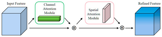 The CBAM attention mechanism module is a combination of channel and spatial attention, which operates first through the former and then through the latter [13]. The weights obtained by the two attention modules multiplied by the corresponding location feature map element values are derived from the adaptive feature information. Compared with other attention mechanisms based on single attention, CBAM combines the two to achieve better results in model performance. Its structure is shown in Figure 4.