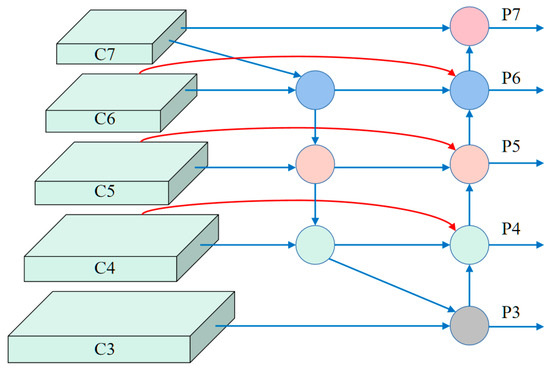 Based on the bidirectional path fusion of PANet, Google proposed the BiFPN feature fusion method. BiFPN boasts simultaneous access to bidirectional multi-scale connection and unique feature weighted fusion mode, which not only strengthens the fusion of different scale feature information between the deep layer and shallow layer but also adds horizontal correlation between the same scale feature information, thus effectively avoiding the loss of feature information caused by too deep a feature extraction network. Its structure is shown in Figure 5.