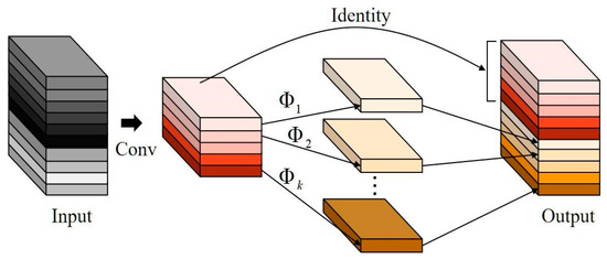 Huawei Noah’s Ark Laboratory proposed the lightweight network GhostNet in 2020, designing a unique convolutional structure that significantly reduces the amount of computation. The detection effect is slightly improved under the same amount of computation compared with other lightweight networks. The design idea comes from the visual analysis of the intermediate feature images generated in the process of deep learning, and it is found that the abundant and redundant information in the feature map can often reflect the comprehensiveness of the input data. Therefore, the researchers designed a low-cost and high-yield Ghost convolution unit to carry out these feature mappings containing redundant information to reveal the information behind the intrinsic features fully. The Ghost convolution unit adds the weight value of the feature map obtained by depth convolution to the input feature map to retain the context feature information better. GhostNet designs a unique Ghost module based on the Ghost convolution unit to extract features from input images. Its structure is shown in Figure 6.