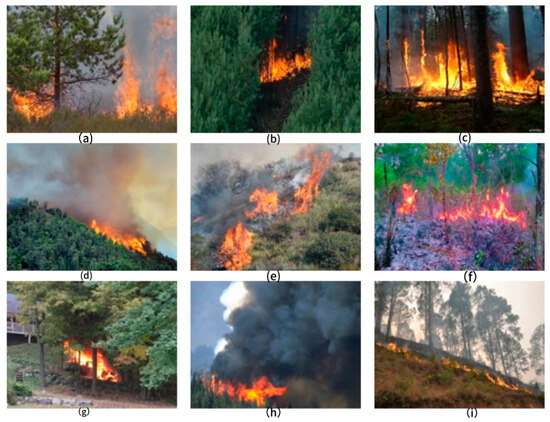 Although there are countless forest fires worldwide every year, gathering images of fires during the fire period is challenging. To study the fire test, 8000 images of open fire and fire smoke were selected to showcase the characteristics of forest fires. Among them, 6500 were used as the training set and 1500 as the verification set (Figure 7).