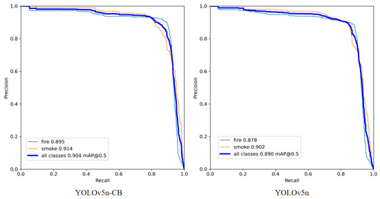 As can be seen from Figure 6, the YOLOv5N-CB model can identify the categories of fire and smoke presented in the figure, while the YOLOv5n model fails to detect them. At the same time, the YOLOv5n-CB model not only identifies the missed flame target of the original model but also has a higher confidence score than the original model, indicating that the model identification is more accurate. Furthermore, the prediction frame is close to the actual frame, indicating that the improved model has a good detection effect, proving the proposed model’s application value.