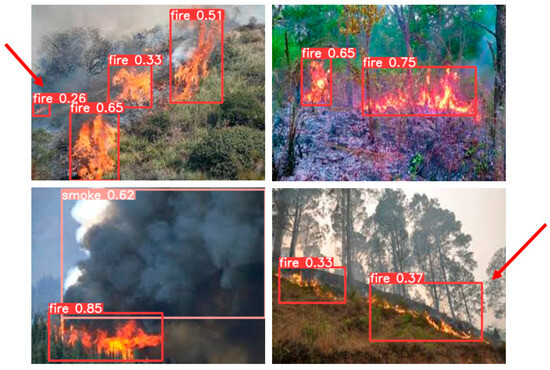The experiments have shown that the performance of the YOLOv5n-CB algorithm model proposed in this paper is better. The results of model recognition are visualized and analyzed using the test pictures; part of the recognition effect is shown in Figure 10. The red arrows refer to the flame targets missed by the original model (e) and (i) in Figure 7.