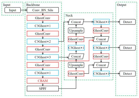 According to the above experimental verification, applying the lightweight strategy of the GhostNet network to the YOLOv5n-CB model is necessary. The new model is named G-YOLOv5-CB, whose structure is shown in Figure 11.