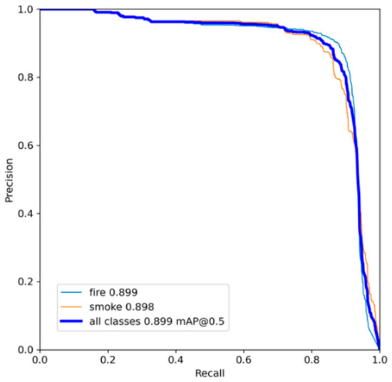 The G-YOLOv5-CB model was trained with the same training configuration as above. The P-R curve of the training process of the model is shown in Figure 12, where the AP values of fire and smoke targets, namely, the area under the curve, are both about 0.9, which proves that the proposed improved G-YOLOv5-CB model has excellent performance in feature extraction and feature fusion of targets.
