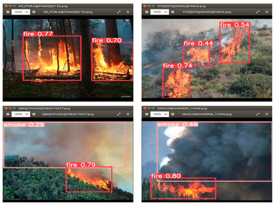 The forest fire real-time monitoring system designed in this paper adopts Jetson Nano as the detection platform for development. After setting up the environment, we copy the YOLOv5 file package containing the changes in the G-YOLOv5n-CB model relative to the original model and the best-pt file saved with the training results of the above model, respectively, into the Jetson Nano system and the project, and use best-pt as the detection model to capture the input image. After completing the deployment of the model, parts of the images from the forest fire dataset are selected for testing on the Jetson Nano development board, and the specific test results are shown in Figure 13; the model can detect both the fire and smoke targets presented in the picture. The average detection time is 0.065 s and the average frame rate is about 15 FPS. The fast detection speed of the model proves the effectiveness of the lightweight strategy and can meet the real-time requirements of forest fire detection.