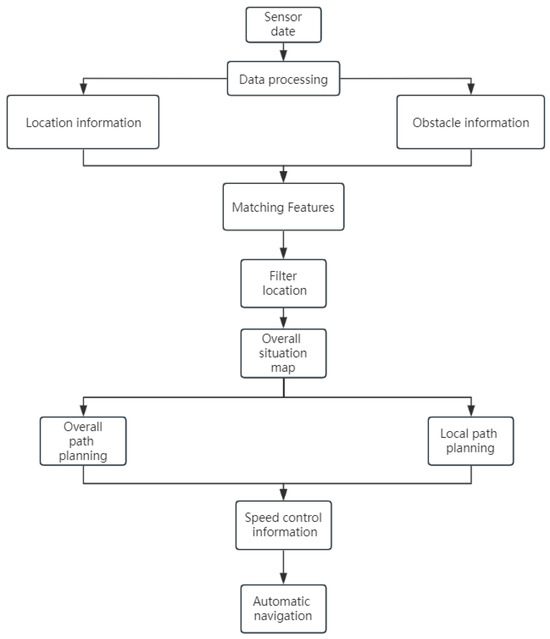The robot’s autonomous navigation in the campus woodland undergoes the process from the set starting point to the destination, and how it navigates is similar to autonomous driving. The structure of the automatic navigation system is shown in Figure 17.