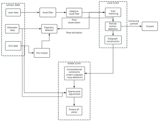 The Cartographer algorithm based on the graph optimization theory proposed by the Google team is adopted as the map construction algorithm in this study [16]. It mainly includes sensor data processing, local mapping, and global optimization [17]. The overall framework flow of the algorithm is shown in Figure 18.