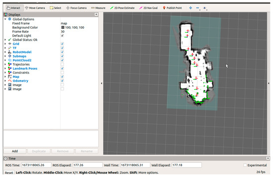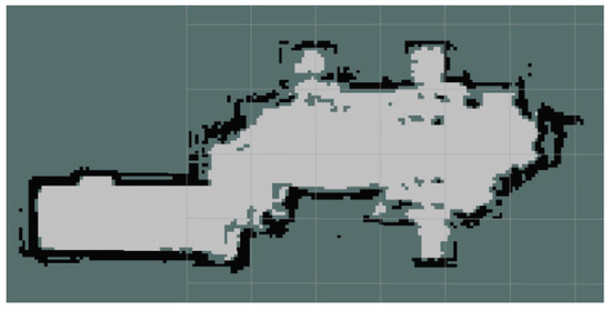 To verify the mapping capability of the Cartographer algorithm in actual scenarios, this experiment uses the Cartographer algorithm in the ROS system to construct raster maps that are convenient for the subsequent movement of robots. To control the robot more conveniently during the process of drawing construction, the robot is generally controlled by a keyboard to move in the drawing environment. After the keyboard control function is opened by inputting the keyboard control command on the PC side, the robot can be controlled to realize the walking and turning functions in the natural environment. The Rivz interface in Figure 19 shows the real-time mapping scene when the robot walks through the whole area in the experiment scene. The white area in the figure is the map being built, and the green lines are the map boundaries scanned by the radar during operation.