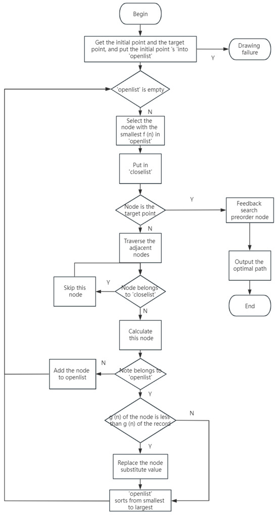 The A* algorithm searches the map path by estimating the moving cost of nodes on the map, and its calculation formula is shown in Formula (1).