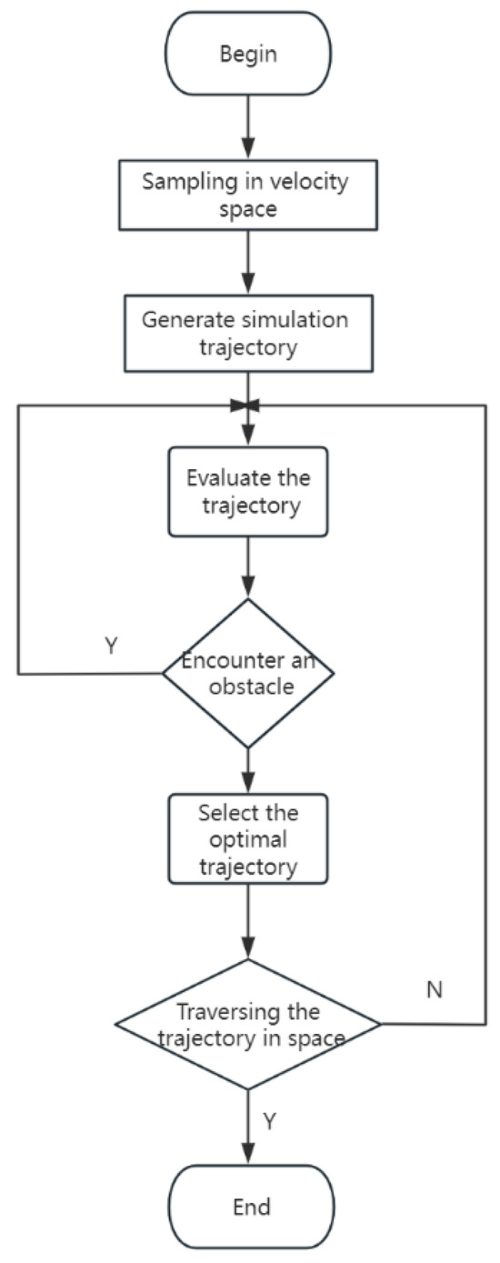 In Figure 21, the DWA algorithm first samples the velocity space of the robot and then estimates the possible moving trajectory of the robot in the velocity space. The evaluation function evaluates each trajectory. If there is an obstacle, the trajectory is skipped; if there is no obstacle, the optimal trajectory is selected. The robot’s status is finally updated after traversing all generated trajectories in space.