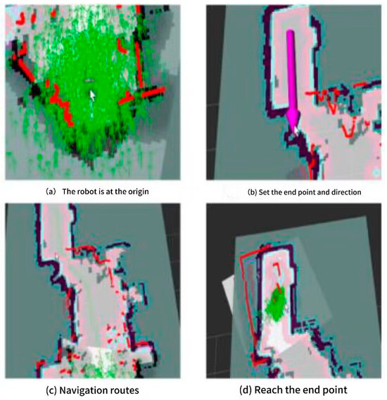 Figure 23a shows the starting point position of the robot. Figure 23b shows the setting of the endpoint position and direction in the Rviz interface using the 2D Nav Goal tool mouse. The green line in Figure 23c is the global path planned by the A* algorithm, and the short red line segment in front of the robot is the local path generated by the DWA algorithm. Figure 23d shows the robot reaching the endpoint. The experiment demonstrates that the robot can reach the endpoint following the established route and realize free navigation between the two points in the process of global navigation. At the same time, the navigation obstacle avoidance function is tested by placing obstacles on the robot’s route.