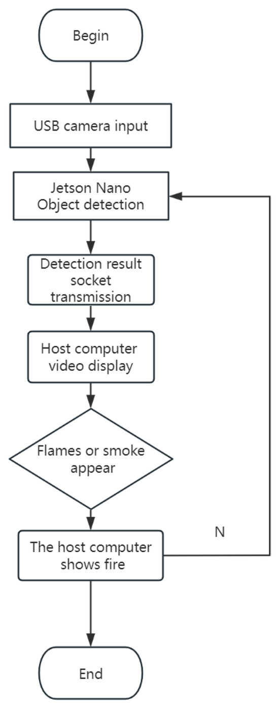 The upper computer interface is based on the PyQt5 design of the campus forest fire real-time monitoring system interface. Using a GUI programming method to write a visual interface, PyQt5 is a kind of human–computer interaction software that can be operated through the peripherals without inputting instruction codes. The PyQt5 interface can be designed to display the detection results more intuitively. Different buttons display target detection results, robot control, sensor information, and fire alarm information. Among them, the implementation process of the forest fire detection module of the system is first to collect environmental information through the USB camera and then to conduct real-time detection on the Jetson Nano embedded platform. At the same time, the detection result is transmitted to the display interface of the upper computer in real time through Wi-Fi and socket protocol. The specific execution flow chart is shown in Figure 24.