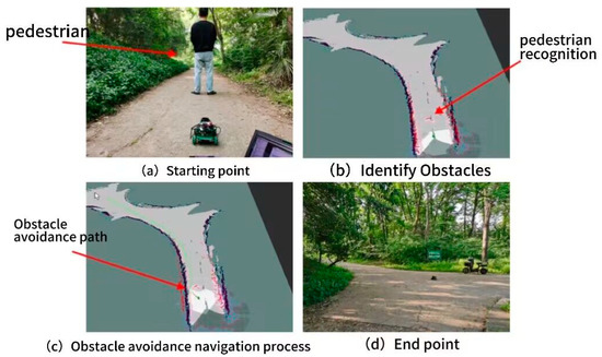 Figure 25a shows the robot at the starting point, with the simulation of the pedestrians existing in the actual woodland scene as obstacles. Figure 25b shows that the system successfully identifies the obstacles. Figure 25c shows that the system successfully avoids obstacles in the navigation process. The green line in the figure is the global planned path, and the short red line is the local planned path. Figure 25d shows that the system successfully reaches the target point and realizes the campus woodland scene’s navigation and obstacle avoidance functions.