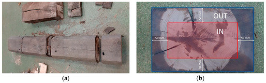 Wooden railroad ties with cracks on external surfaces and in cross-sectional areas: (a) tie cut for specimen preparation; (b) cross-section revealing areas impregnated with creosote with internal (IN) and external (OUT) parts marked out.