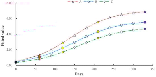 Logistics model could well reflect the growth rhythm of P. yunnanensis seedlings and provide a reliable quantitative model for the analysis and prediction of different growth stages of P. yunnanensis. According to the growth of seedling height in different months, the Logistics growth curve of seedling height was calculated and fitted (Figure 1, Table S1). As shown in the figure, the height growth of different grades of seedlings showed an “S” curve with time, that is, the growth rhythm of “slow–fast–slow”. At the same time, both the seedling height and ground diameter of P. yunnanensis showed the order of Grade A > B > C, and the increment in the seedling height of the three grades of P. yunnanensis in March was prominently more than that in other months (Table S1), when seedlings were entering the fast-growing period (March) (Figure 1). Therefore, the beginning of a fast-growing period t1 was at 69~80 d, the end of a fast-growing period t2 was at 211~237 d, and the duration of a fast-growing period ts was at 140~159 d (Table 1). After entering the fast-growing period of seedling height, the growth rates of seedling height of different grades were significantly different. The height growth rate of Grade A seedlings was remarkably higher than that of Grade B and C seedlings, and the overall growth rhythm of the three grades of seedlings was relatively consistent. All showed a slow–fast–slow S-type growth curve. Therefore, the length of seedling growth period does not primarily account for the variation in seedling growth. Instead, the timing and duration of the fast-growing period, whether it occurs sooner or later, directly impact seedling growth.