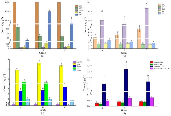 Endogenous phytohormone content of P. yunnanensis seedlings of different grades. Error bars represent the standard error of the mean (SD) for each data point, with a sample size of three (n = 3). (a) ACC (1-amino-1-cyclopropanecarboxylic acid), ABA (abscisic acid), OPDA (12-oxadienoic acid), SA (salicylic acid), and SAG (glycosylated salicylic acid). (b) IPA (isopentenyl adenine nucleoside), IP (isopentenyl adenine), TZR (trans zeatin nucleoside), TZ (trans zeatin), and DZ (dihydrozeatin). (c) Me-IAA (indole-3-methyl acetate), IAA (indole-3-acetic acid), ICAd (indole-3-formaldehyde), JA (jasmonic acid), and JAIle (jasmonic acid-isoleucine). (d) Auxins/ABA, CTKs/ABA, Auxins/CTKs, (Auxins + CTKs)/ABA. Because the ACC content value is too large, it cannot be marked with significance. Lowercase letters denote significant differences among different grades at a significance level of p < 0.05, as determined by Duncan’s test. Different colors indicate different hormones.