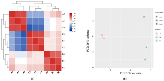 The pairwise Pearson correlation coefficients were calculated for the sequencing data obtained from three replicates of each sample collected at the three levels. (a) Principal component analysis (PCA) was performed on the transcriptome data collected from samples at the three levels (b).