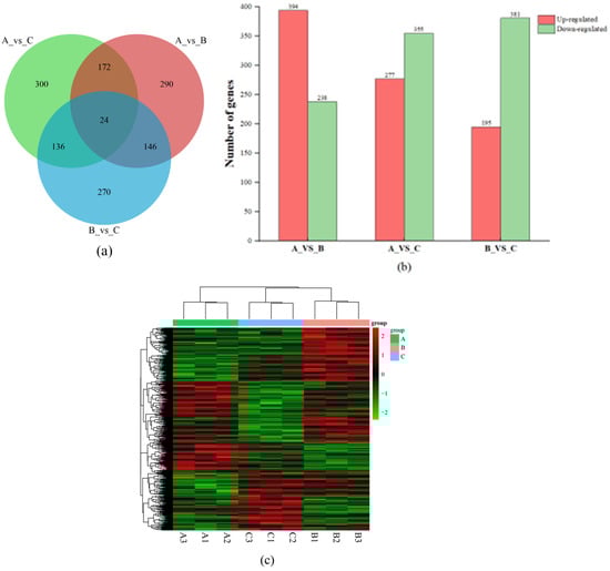 Pairings of different grades (A, B, C) of P. yunnanensis seedlings were compared to identify the characterization of DEGs. (a) Venn diagram of three pairs comparing DEGs numbers (A-vs-B, A-vs-C, and B-vs-C). (b) The number of upper and lower DEGs in each pair is compared. Green represents the down-regulation of DEGs, while red represents the up-regulation of DEGs. (c) Clustering analysis of DEGs. Horizontal represents genes, vertical represents samples, red represents high-expression genes, and green represents low-expression genes.