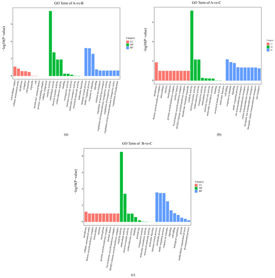 GO enrichment analysis of DEGs. The abscissa is the GO term of enrichment, and the ordinate is the p-value of the term enrichment. (a) GO term of A-vs-B; (b) GO term of A-vs-C; and (c) GO term of B-vs-C.