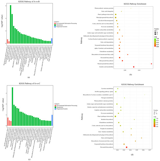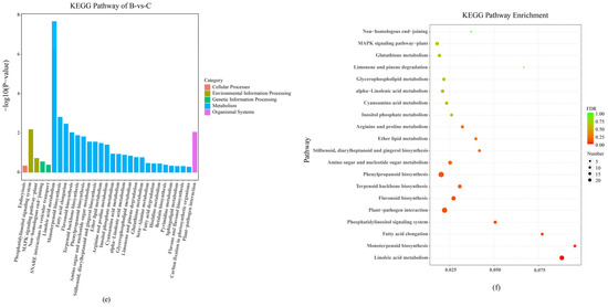 KEGG functional annotation analysis was performed on the differentially expressed genes. In A-vs-B, the KEGG enrichment analysis classified the DEGs into three major categories. The top pathways included “plant hormone signal transduction” in environmental information processing, “linoleic acid metabolism” in metabolism, and “plant–pathogen interaction” in organismal systems (Figure 6a,b). In A-vs-C, the top pathways included “MAPK signaling pathway plant”, “plant hormone signal transduction”, “flavonoid biosynthesis”, and “plant–pathogen interaction” (Figure 6c,d). In B-vs-C, these DEGs were classified into five major categories, “endocytosis” in cellular processes, “phosphatidylinositol signaling system” in environmental information processing, “non-homologous end joining” in genetic information processing, “linoleic acid metabolism” in metabolism, and “plant–pathogen interaction” in organismal systems (Figure 6e,f). There were significant differences in enrichment pathways between the pairwise comparisons. The “plant hormone signal transduction” pathway exhibited enrichment in the two groups, followed by “plant–pathogen interaction” pathway in the organism system was enriched in the three groups. Different pathways appear to be important at different plant heights. These results indicated that the above pathways could be closely associated with the plant height of P. yunnanensis and affect the growth of seedlings.