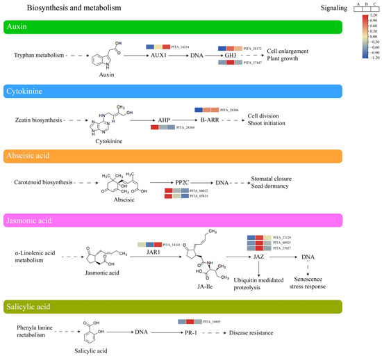 Eleven DEGs were identified through pairwise comparisons among the three grades of P. yunnanensis seedlings. These DEGs were linked to phytohormone-related biosynthesis and signal transduction pathways (Figure 7). AUX1 (auxin influx carrier, AUX1 LAX family) serves as a crucial auxin transporter during the biosynthesis of IAA, whose (PITA_14214) gene is down-regulated from Grade A to Grade C seedlings. However, there were two DEGs in the GH3 (auxin responsive GH3 gene family) node that exhibited different fluctuating trends in three grades, the gene (PITA_28172) was up-regulated from Grade A to Grade C seedlings, and the GH3.6 gene (PITA_37447) was down-regulated. The results indicated that AUX1 and GH3 genes play major regulatory roles in the auxin signal transduction pathway and could influence plant growth. In the metabolic pathway of cytokinin signal transduction, one differential gene (PITA_28368) was down-regulated in the AHP (histidine-containing phosphotransfer peotein) node, and one differential gene (PITA_28306) was down-regulated in the B-ARR node.