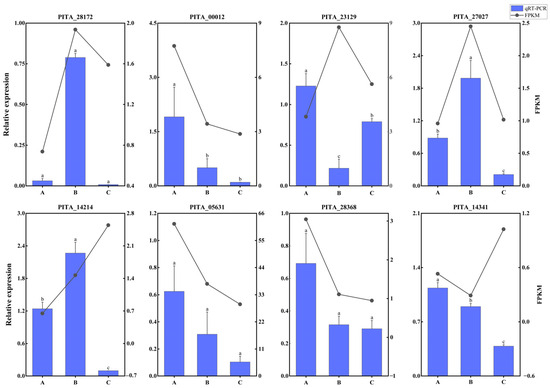 Eight genes involved in the metabolism of auxins, cytokinin, abscisic acid, and jasmonic acid were obtained by screening the RNA-seq data of three grades of P. yunnanensis seedlings (Figure 8, Supplementary Table S3). Among these eight genes, there were one AUX (PITA_14214) and one GH3 (PITA_28172) genes associated with auxin metabolism; one AHP (PITA_28368) gene related to cytokinin metabolism; two genes related to PP2C, a regulator of abscisic acid signaling (PITA_00012, PITA_05631); and there were one JAR1 (PITA_14341) and two JAZ (PITA_23129, PITA_27027) related genes regulating jasmonic acid signal transduction. QRT-PCR validation was performed to be based on the above eight DEGs for hormone metabolism. Although there were some differences between the results obtained from qRT-PCR and RNA-seq, the expression trend was basically consistent. For instance, in the transition from Grade A to C, the relative expression levels of PITA_05631, PITA_28368, and PITA_00012 showed a decreasing trend; specifically, from Grade A to B, the relative expression levels of PITA_28368 and PITA_00012 decreased by 50%, which suggested they could have more available roles in height growth of P. yunnanensis seedling. Furthermore, the relative expression levels of PITA_28172, PITA_27027, and PITA_14214 increased from Grade A to B and then decreased from Grade B to C; while the relative expression level of PITA_23129 was the opposite, which displayed they might have some effects on the differentiation of P. yunnanensis seedlings. As shown in Figure 8, only the data of PITA_23129 and PITA_14341 show different trends in RNA-Seq and qRT-PCR analysis. The expression profiles of six DEGs obtained via qRT-PCR were basically in line with those of RNA-seq, which indicated the reliability of the RNA-seq results.