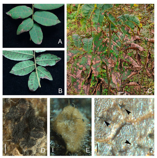 Typical symptoms of Cyclocarya paliurus anthracnose. (A) Front and (B) reverse view of irregular necrotic lesions on leaves; (C) field symptoms; (D) Colletotrichum fruiting bodies of ascomata and (E,F) Acervuli developed on diseased leaf tissues, with arrows point to setae. Scale bars: (D) =200 μm; (E) =50 μm; (F) =100 μm.