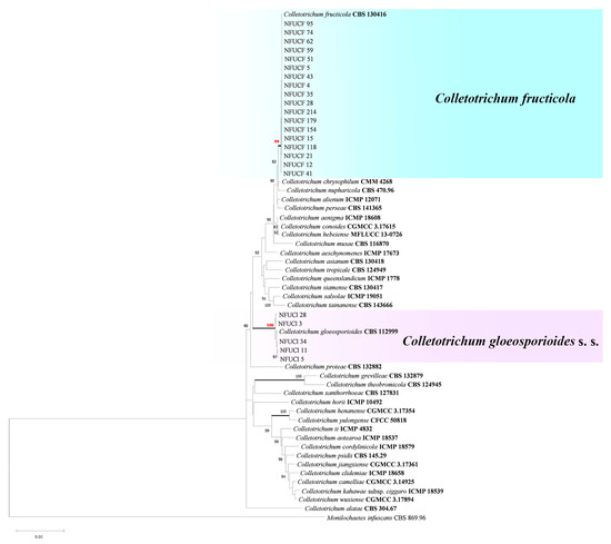 For isolates in the Gloeosporioides complex, phylogenetic analyses of eight concatenated loci (ITS, GADPH, CHS-1, ACT, TUB, CAL, GS and ApMat) sequences were carried out with corresponding sequences from 39 authentic specimens (Table A1). The concatenated matrixes of the aligned dataset were composed of 3537 characters and gaps in the alignment. The GTR+G model was selected based on the AIC to reconstruct the ML tree. For BI analysis, the corresponding models were selected by MrModeltest: GTR+I+G for ITS; K80+G for GAPDH and ApMat; HKY+I+G for CHS-1; and GTR+G for ACT, TUB, CAL and GS. The isolates in the Gloeosporioides complex were clustered into two well-supported clades (Bv > 99% and Bayesian PP = 1.00): 18 isolates were grouped into the C. fructicola clade, and five were clustered with C. gloeosporioides s. s. (Figure 2).