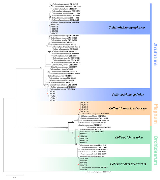 To identify the Colletotrichum species within the Acutatum, Magnum and Orchidearum complexes, a dataset of six combined genes (ITS, GADPH, CHS-1, ACT, TUB and HIS3) from 49 authentic specimens was used, and the dataset comprised 1905 characters after alignment. The ML tree was reconstructed utilizing the GTR+G+I model. The best models for BI were found by MrModeltest: GTR+I+G for ITS, CHS-1 and HIS3, K80+G for GADPH, GTR+G for ACT, and HKY+I+G for TUB. The isolates in the Acutatum complex could be well defined as C. nymphaeae and C. godetiae because five isolates clustered together with the C. nymphaeae ex-type strain CBS 515.78 with strong support (99% Bv/1.00 PP), and five isolates clustered in another highly supported clade (99% BP/1.00 PP) with the C. godetiae type strain CBS 133.44. Among the isolates in the Orchidearum complex, five were grouped in C. plurivorum Damm, Alizadeh & Toy. Sato (98% Bv/1.00 PP), whereas the other five isolates were clustered with C. sojae Damm & Alizadeh (99% Bv/1.00 PP). Additionally, the remaining five isolates clustered with the C. brevisporum authentic strain BCC 38876 with high support (99% Bv/1.00 PP) in the Magnum clade (Figure 3).