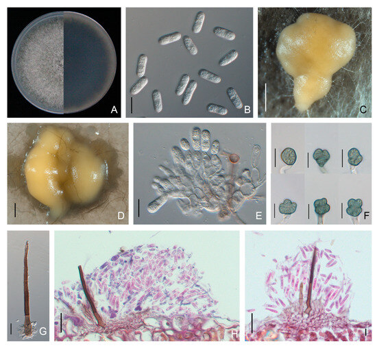 Morphological features of Colletotrichum brevisporum isolate NFUCB-6 from Cyclocarya paliurus: (A) front and back views of a 6-d-old PDA culture; (B) conidia; (C,D) conidiomata produced on PDA and SNA, respectively; (E) conidiophores; (F) appressoria; (G) setae; (H,I) section view of acervuli produced on a Cyclocarya paliurus leaf. Scale bars: (B,E–G) =10 μm; (C) =200 μm; (D) =500 μm; (H,I) =20 μm.
