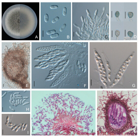 Morphological features of Colletotrichum fructicola isolate NFUCF-62 from Cyclocarya paliurus. (A) Front and back views of a 6-d-old PDA culture; (B) conidia; (C) conidiophores; (D) appressoria; (E) ascomata; (F,G) asci; (H,I) ascospores; (J,K) section view of acervuli and ascomata produced on a Cyclocarya paliurus leaf, respectively. Scale bars: (B–D,F–I) =10 μm; (E,J,K) =20 μm.