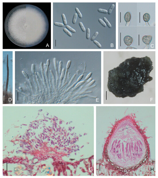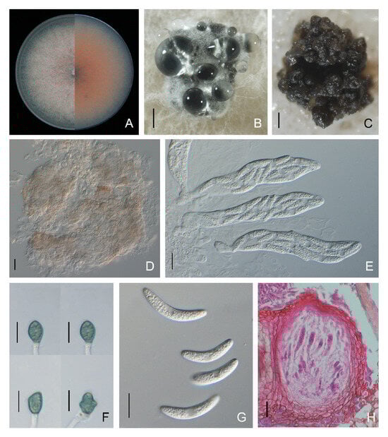 Morphological features of Colletotrichum sojae isolate NFUCS-10 from Cyclocarya paliurus. (A) Front and back views of a 6-day-old PDA culture; (B,C) ascomata produced on PDA and SNA, respectively; (D) ascomata; (E) asci; (F) appressoria; (G) ascospores; (H) section view of ascomata produced on a Cyclocarya paliurus leaf. Scale bars: (B) =500 μm; (C) =200 μm; (D,H) =20 μm; (E–G) =10 μm.