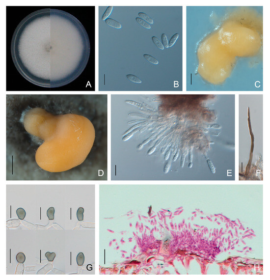 Morphological features of Colletotrichum plurivorum isolate NFUCP-13 from Cyclocarya paliurus. (A) Front and back view of 6-day-old PDA culture; (B) ascomata produced on SNA; (C) conidia; (D) appressoria; (E) conidiophores; (F) setae; (G) ascospores; (H) asci; (I) section view of ascomata produced on Cyclocarya paliurus leaf. Scale bars: (B) =500 μm; (C–H) =10 μm; (I) =20 μm.
