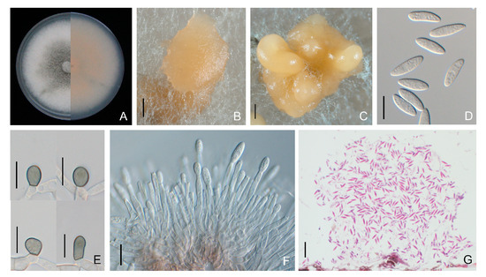 Morphological features of Colletotrichum nymphaeae isolate NFUCN-2 from Cyclocarya paliurus. (A) Front and back views of a 6-d-old PDA culture; (B,C) conidiomata produced on PDA and SNA, respectively; (D) conidia; (E) appressoria; (F) conidiophores; (G) sectional view of acervuli produced on a Cyclocarya paliurus leaf. Scale bars: (B,C) =200 μm; (D–F) =10 μm; (G) =20 μm.