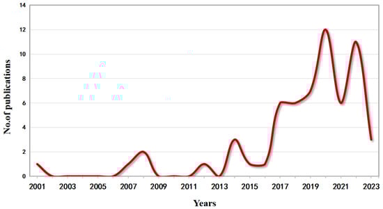 Figure 2 illustrates the distribution of the amount of research on ecosystem assets published between 2001 and 2023. Research in this area began in 2001, coinciding with the publication of key papers such as Costanza et al.’s (1997) work on the classification and valuation of ES [83], which contributed to the increase in research on AEA. Over time, the amount of research dealing with agroforestry ecosystem assets has experienced fluctuating growth. In particular, after 2016, the amount of research in the literature increased significantly as researchers emphasized the importance of ecosystem assets [84], and the number of studies peaked in 2020 (n = 12), reflecting the development of the field in close relation to the importance of ecosystem services.