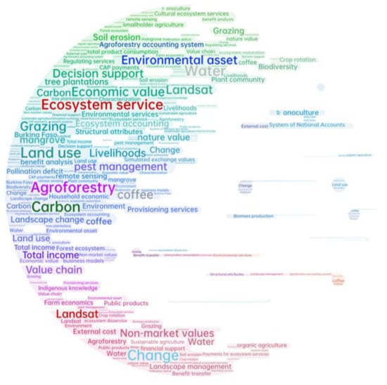 To identify prominent research themes, we employed visualization techniques for word frequency analysis (https://www.weiciyun.com (accessed on 23 November 2023)). By analyzing the titles and keywords of selected articles, a word cloud was generated to highlight key areas in Agroforestry Ecosystem Asset (AEA) research. As shown in Figure 3, excluding the subjective effects of the previous literature search, words such as agroforestry, ecosystem service, environmental asset, accounting, etc., as well as carbon, land use, change, economic value, total income, and related topics, have emerged as prominent themes in AEA research, constituting the primary focus of study. The next hot topics are sustainable agriculture, crazing, benefit, management, Landsat, and so on.