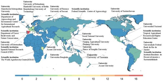 Figure 4 (below) illustrates the geographical and institutional distribution of Agroforestry Ecological Asset Assessment (AEA) research globally. Globally, AEA research exhibits significant regional imbalances and distinct characteristics. In Europe, countries such as Spain, France, Germany, the UK, and Italy dominate with the highest number of publications; in Asia, the main representative countries include China and India; in Africa, Kenya dominates; in North America, Mexico and Costa Rica have a high number of publications; in South America, Brazil is the main representative, and in Oceania, Australia is the most prominent in terms of the number of publications. Overall, Europe leads in publications, followed by Asia, Africa, and North America, with Oceania and South America having fewer publications. The color scale depicted in the graph corresponds to the quantity of distinct articles, with values extending from 0 to 16 articles. Progressing from left to right, the scale transitions from dark blue, denoting a smaller article count, to dark red, signifying a larger compilation of articles.
