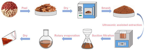 Take the appropriate amount of peanut coat (Bozhou Duandetang Biotechnology Co., Ltd., Bozhou, China), pulverize with an ultrasonic mill (Jiuyang Co., Ltd., Jinan, China, Qsonica, Q700), dry, make powder, and store for use. Ultrasonic-assisted ethanol solvent extraction was adopted. The peanut coating powder was accurately weighed and placed in a beaker, and 70% ethanol was added according to the solid–liquid ratio of 1:10 (w/v), PH = 2, and ultrasound-assisted extraction was carried out at 45 °C for 80 s. The extracted filtrate was vacuumed with a vacuum pump (XIUI Technology Co., Ltd., Shenzhen, China, SHZ-D(III)) to obtain the pigment filtrate. The mixed solution was rotated on the rotary evaporation instrument (Jinan Tongxin Biotechnology Co., Ltd., Jinan, China, RE-52) to remove the ethanol, the temperature was set at 50 °C, and the vacuum degree was set at 0.1 MPa. Finally, the concentrated liquid was freeze-dried by YANYI Scientific Instruments (Shanghai) Co., Ltd., Shanghai, China, FreeZone® into pigment powder. Figure 1 shows the process.