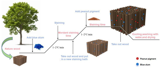 Under the prevailing global trend of environmental degradation, wood has garnered significant attention as a renewable and eco-friendly biological substrate [1,2,3]. Due to its rich resources, wood is widely used in industry, furniture, energy, construction, and other fields [4,5]. However, due to inherent limitations in its properties, specific challenges arise when utilizing wood across different fields. For instance, the color of wood could be better, and enhancing its economic value through manufacturing and production becomes arduous. People have resorted to employing diverse dyes for staining to augment the added value of wood products. Reactive dyes and alkaline and acidic dyes are commonly used in wood staining [6]; however, their usage poses persistent ecological concerns regarding chemical waste treatment [7]. Natural dyes have gained widespread recognition and research interest due to their green nature, non-toxicity, and biodegradability of associated wastewater [8].