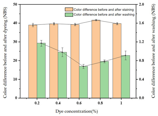 Figure 5 clearly shows that with the increase of mordant alum, the color difference value also shows an upward trend. When the mordant concentration reaches 0.8%, the color difference value of wood reaches the maximum value, and the concentration continues to increase, but it decreases somewhat. It may be because the mordant concentration is small; the dye cannot be thoroughly combined with the wood, resulting in a lighter color after staining. When the mordant concentration exceeds 0.8%, due to excessive metal ions, excess metal ions are easy to adsorb and aggregate on the surface of wood, resulting in floating color and decreased colorfastness to washing [43]. Therefore, the mordant concentration of peanut coat pigment should be selected at 0.6~1%.