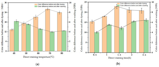 (a) Effect of direct staining time on color difference and colorfastness to washing of poplar. (b) Effect of direct staining temperature on color difference and colorfastness to washing of poplar.