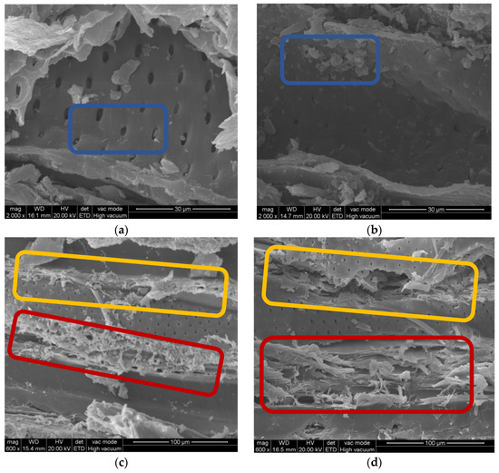 Figure 7a,c show the 2000 and 600 times images of poplar direct staining by peanut pigment with SEM; Figure 7b,d show the 2000 and 600 times images of mordant staining (with alum added) observed by SEM. It can be seen that the surface morphology of veneer is very different from that of direct staining wood and mordant staining wood. From Figure 7a, it can be seen that there are a few dye molecules around the wood grain holes of the direct staining veneer (shown in the blue box), and from Figure 7c, the surface of the tube wall is smooth and flat (shown in the yellow box). In contrast, in Figure 7b, the mothballs and surrounding areas of the mordant staining veneer have a high degree of agglomeration, and a large number of dye molecules are attached to the wall of the guide tube [32]. It can be observed from Figure 7d that the surface of the wood guide tube wall of the mordant staining veneer is rough. It was observed that after mordant staining with alum, the cracks and voids distributed between the wood fibers of poplar increased (as shown in the red box), and when the dye liquid moved along the duct cavity and fiber cells, more adsorption points were provided for the dye molecules, thus improving the staining effect of the wood.