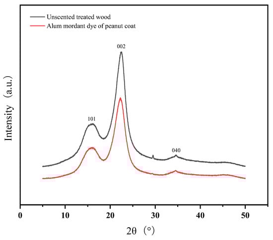 As can be seen from Figure 8 and Table 10, the diffraction peak position of crystal plane 002 is concentrated at 22.26~22.42, which shows that the staining treatment has no apparent influence on the crystallization zone of wood cellulose and does not change the crystal layer distance of the crystallization zone. The relative crystallinity of untreated poplar and alum mordant staining poplar are 71.27% and 71.51%, respectively. It has a specific change, but the change range is not extensive, so the staining treatment has little influence on its properties and subsequent processing [23]. The crystallinity of poplar dyed with mordant is slightly improved, which shows that dye molecules can quickly enter the wood, deposit, adsorb, and react inside the wood.
