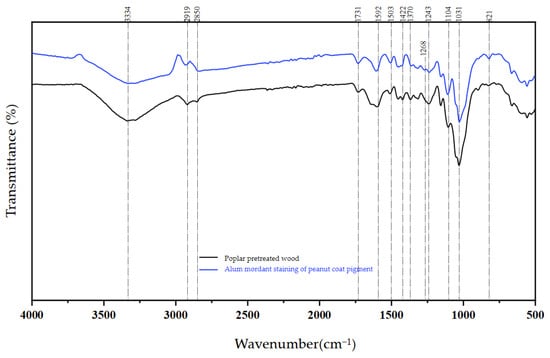 - FRIR test analysis shows that the vibration peak of the carbon skeleton of poplar pre-mordanted with alum is much weaker than that of unstained wood and directly dyed wood. It is speculated that Al3+ bridges the phenolic hydroxyl group in lignin, benzene ring, and phenolic hydroxyl group in peanut coat to form a complex structure, enabling wood to absorb more dyes and effectively improving its staining fastness.