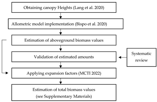 Flowchart of the methodology used to estimate forest biomass in the Cerrado biome studied, cited references are [7,12,20].