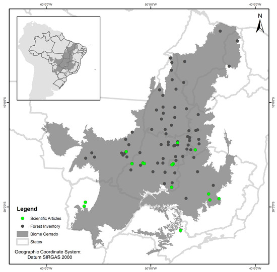The inclusion and exclusion criteria for the results of the articles were analyzed based on the potential use of presented biomass values, involving both live and dead aboveground biomass, with either field sampling or direct biomass estimation in the Cerrado biome. Only estimates from natural formations were considered, excluding plantations or exotic species. When available, the following information was compiled from the articles: location, plot area, sampling date, phytophysiognomy type, measurement method, tree diameter and height values, number of individuals per hectare, employed hypsometric, volumetric and allometric equations, wood basic density of dominant species, basal area, mean and standard deviation values of biomass (aboveground, roots, litter, and total).